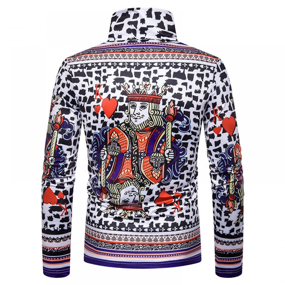 New Men's Large Size 3D Retro Playing Cards Floral Print High Neck Long Sleeve T-Shirt Bottoming Shirt